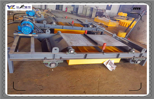 工作時(shí)除鐵器懸掛在輸送皮帶的上方,當(dāng)輸送的物料經(jīng)過除鐵器的強(qiáng)磁場時(shí),混雜在物料中的鐵磁性物質(zhì)在除鐵器的強(qiáng)磁吸引力的作用下,被牢牢吸附在卸鐵皮帶上,同時(shí)通過驅(qū)動(dòng)電機(jī)驅(qū)動(dòng)皮帶運(yùn)轉(zhuǎn)將鐵磁性物質(zhì)拋出現(xiàn)場,從而達(dá)到自動(dòng)除鐵的目的。